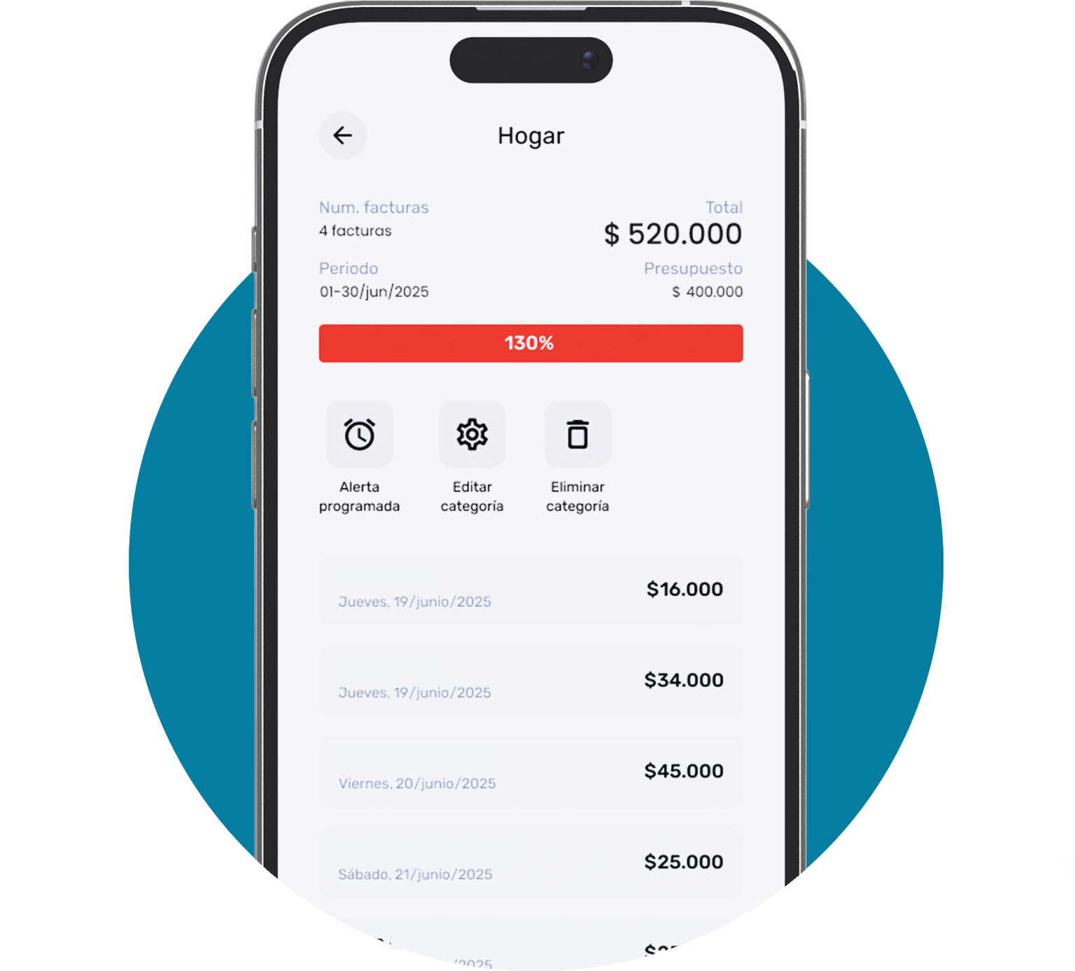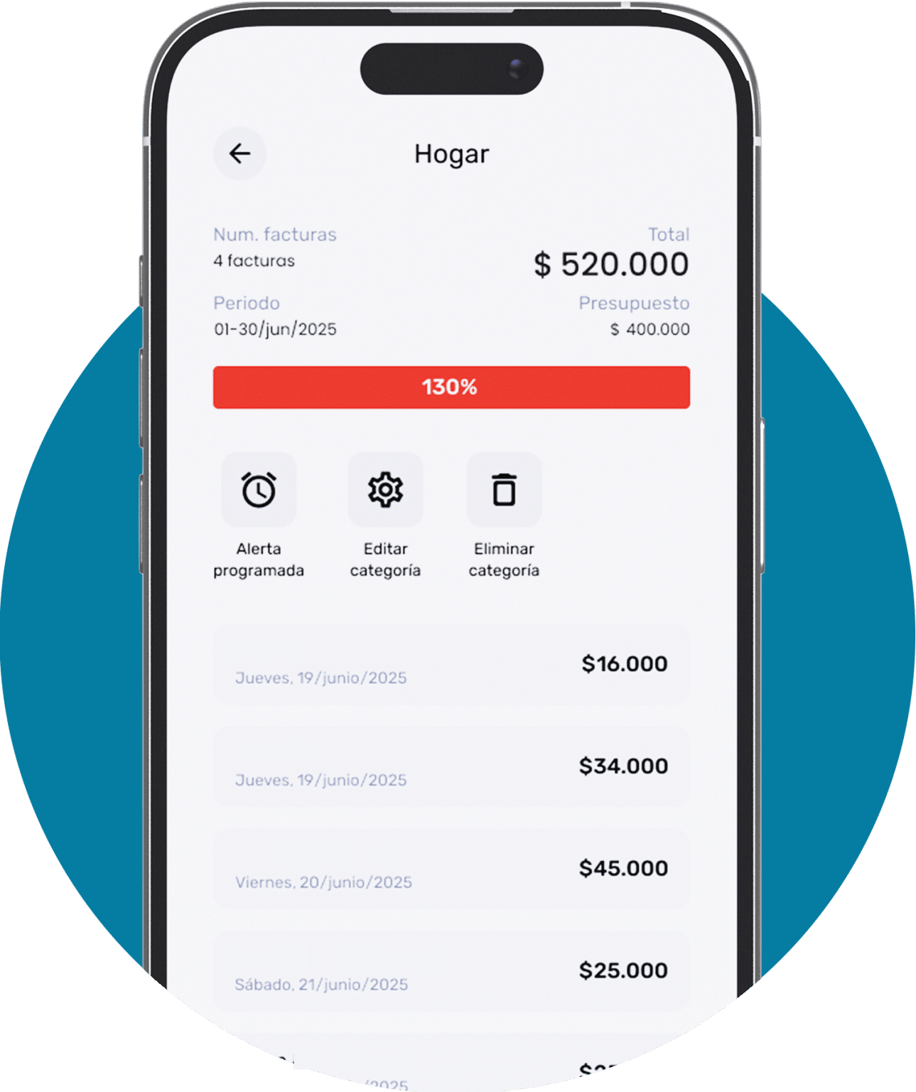 Para editar el nombre, ícono, color, periodicidad o presupuesto de cualquier categoría, haz clic en el detalle de la categoría y luego en ‘editar’ que se encuentra en la parte superior derecha, realiza los ajustes y guarda los cambios.